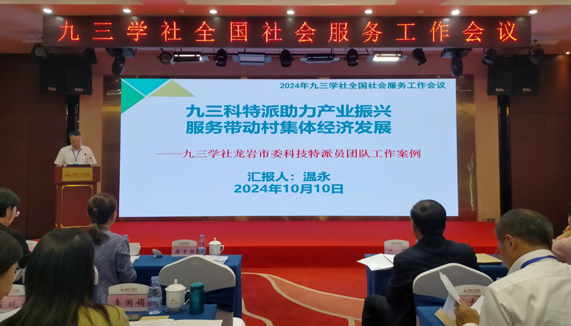 10月10日,在深圳市召开的九三学社全国社会服务工作会议上,九三学社福建省委副主委、社龙岩市委主委、龙岩市政协副主席温永做有关九三学社龙岩市委科技特派员团队典型经验的介绍,详细介绍该团队成立以来采取的各项帮扶措施、取得的成效以及对农村集体经济组织作出的贡献。与会人员纷纷点赞,认为社龙岩市委科技特派员团队工作很有特色、很有成效,值得各地借鉴学习,以共同推动九三学社社会服务工作再上新台阶。